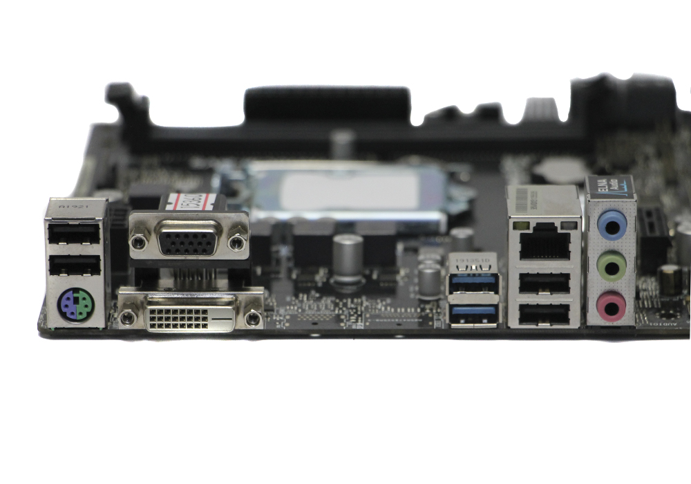 1x PS/2 (мышь или клавиатура); 1x VGA, 1x DVI; 4x USB2.0; 2x USB3.0; 1x LAN RJ-45; 3x Audio jack